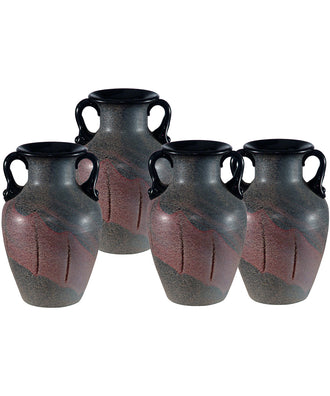 Our Myria 4-Piece Art Glass Vase Set features a look so like natural stone, you will forget it's actually crafted of hand blown Favrile Art Glass. The set includes 4 urn style vases. Each vase has a black base color to which we added natural umber accents and mixed the 2 to create the stone-like appearance. We then added a large brush stroke in reverse of umber with black accents to create yet another level of texture. Finally, we added a pair of haphazard “scratch” marks which give the vases a primitive feel. A perfect choice on bookshelves or mantels, your design options are limited only by your imagination. Our Myria 4-Piece Art Glass Vase Set also makes an ideal gift for any occasion.