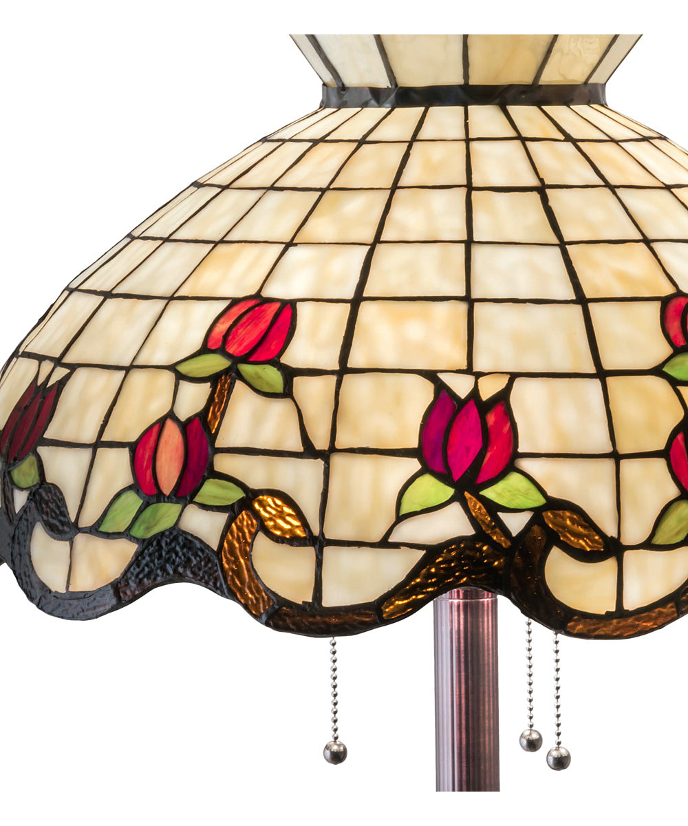 Each Meyda Tiffany item is a unique handcrafted work of art, showcasing the skill and dedication of the artisans who create them. Natural variations in the wide array of materials used make every lamp a masterpiece in its own right. The stained glass shade is meticulously crafted, with each piece of glass carefully selected and assembled to form the beautiful rose border design. This attention to detail ensures that no two lamps are exactly alike, adding to the charm and character of each piece.