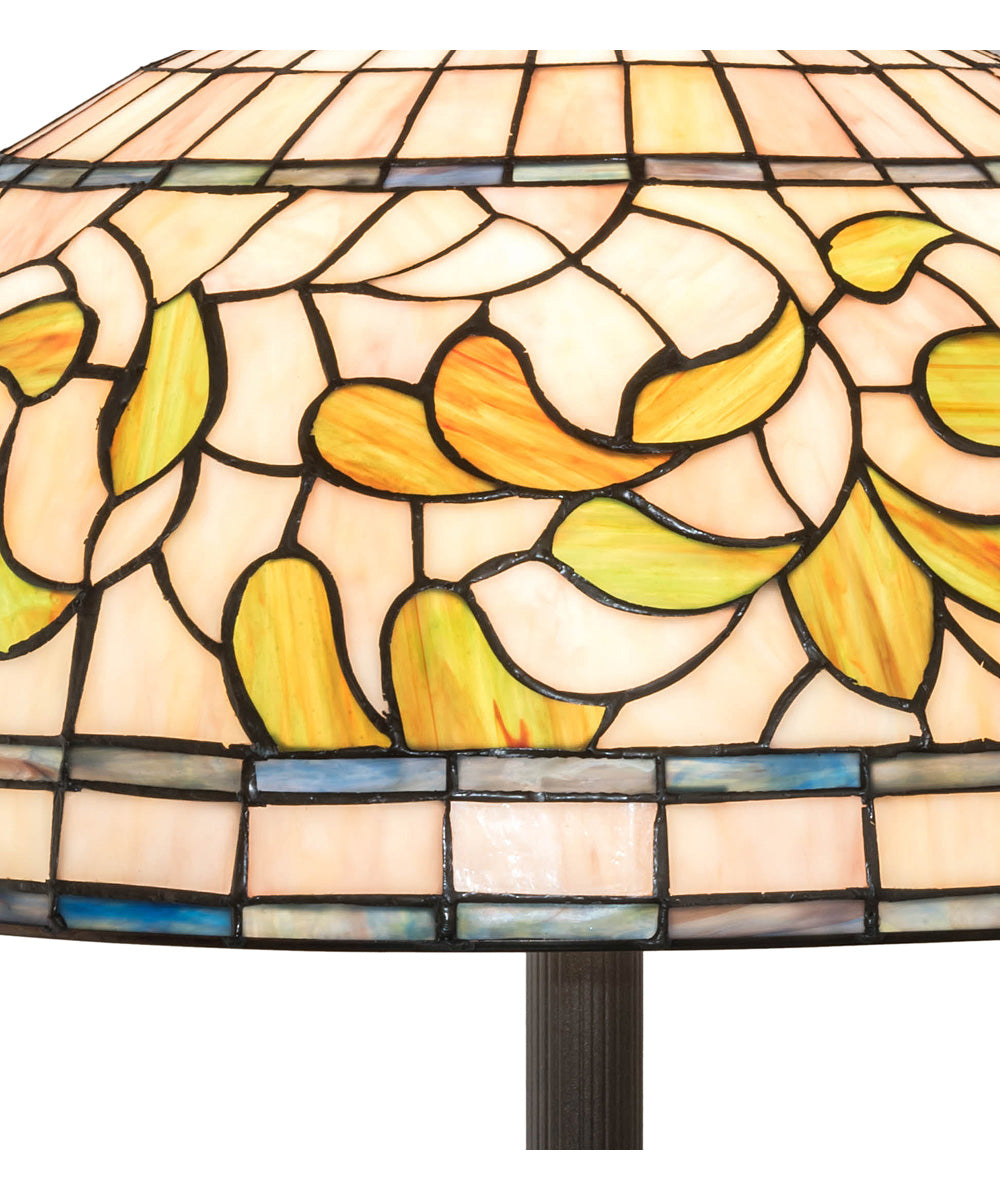 Subtle toned Autumn Gold; Russet and Moss Green leaves swirl against an Amber Mauve background in this Tiffany Studio stained glass reproduction. The shade is enhanced with bands of Purple; Blue and Green and created using the famous Meyda Tiffany copperfoil construction process. This elegant art glass lamp features a Mahogany Bronze finished floor base. Every Meyda Tiffany item is a unique handcrafted work of art. UL and cUL listed for dry locations.