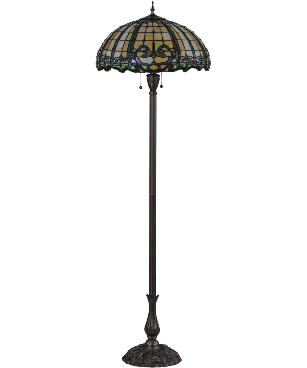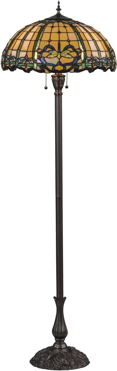 This floor lamp boasts a rich palette of colors, including ruby, pink, sunflower, amber, green, blue, and beige, all brought to life through the use of iridescent glass. The mahogany bronze finish of the metal or polyresin base adds a touch of sophistication and complements the vibrant colors of the shade. Each piece of glass is meticulously selected and assembled using Meyda Tiffany's famous copperfoil construction process, ensuring a high-quality and durable product.