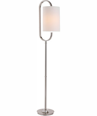 This unique floor lamp features an oval metal strap base, finished in a polished nickel with crystal details. The placement of the round hardback drum shade, in a light beige linen fabric, adds to the uniqueness.