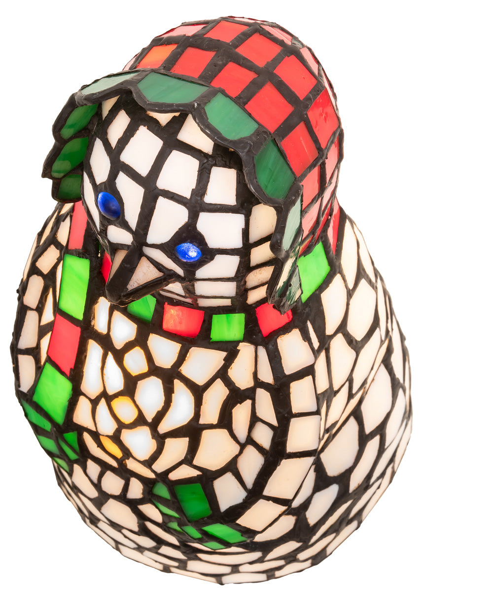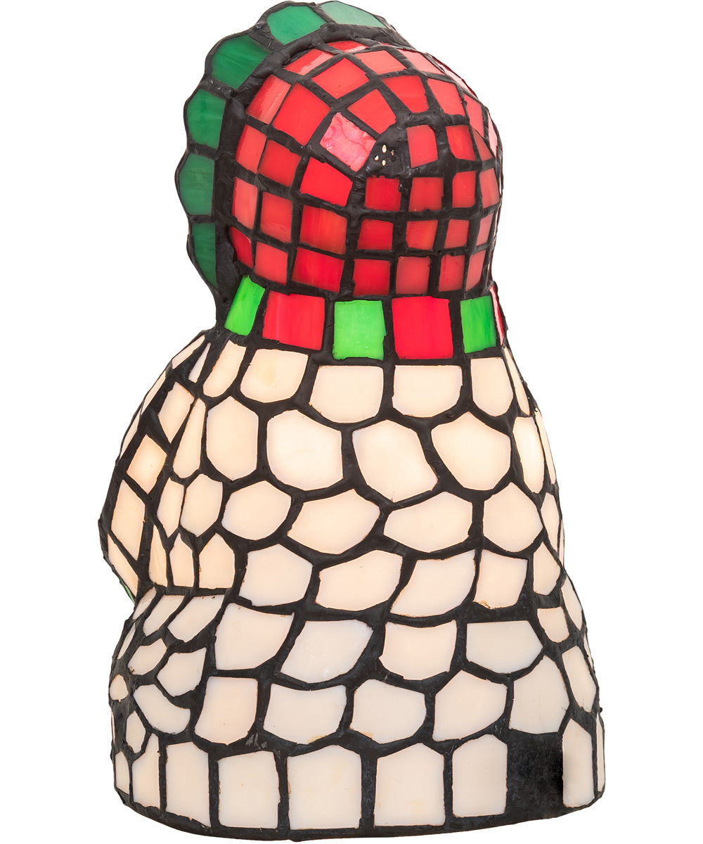 Transform your home into a winter wonderland with this exquisite and charming Snow Woman lighted figurine. Handcrafted of invididual stained glass pieces; the Snow Woman is wrapped in a Holiday Red and Green scarf with matching Green mittens and hat.