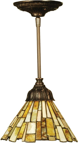 The 8"W DeLighta Jadestone Mini Pendant is a stunning addition to any space, featuring a unique blend of natural materials and expert craftsmanship. The pendant showcases thinly carved and polished natural Jadestone in earthy tones of Moss Green, Tan, Ivory, and Coral. These colors come together to form a tile pattern that is both sophisticated and timeless. The stone shade, crafted using the same copperfoil process as Tiffany-style stained glass shades, adds an air of elegance and refinement to your decor.