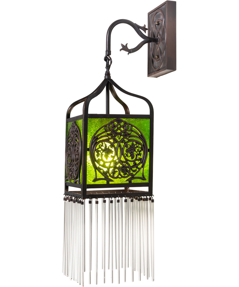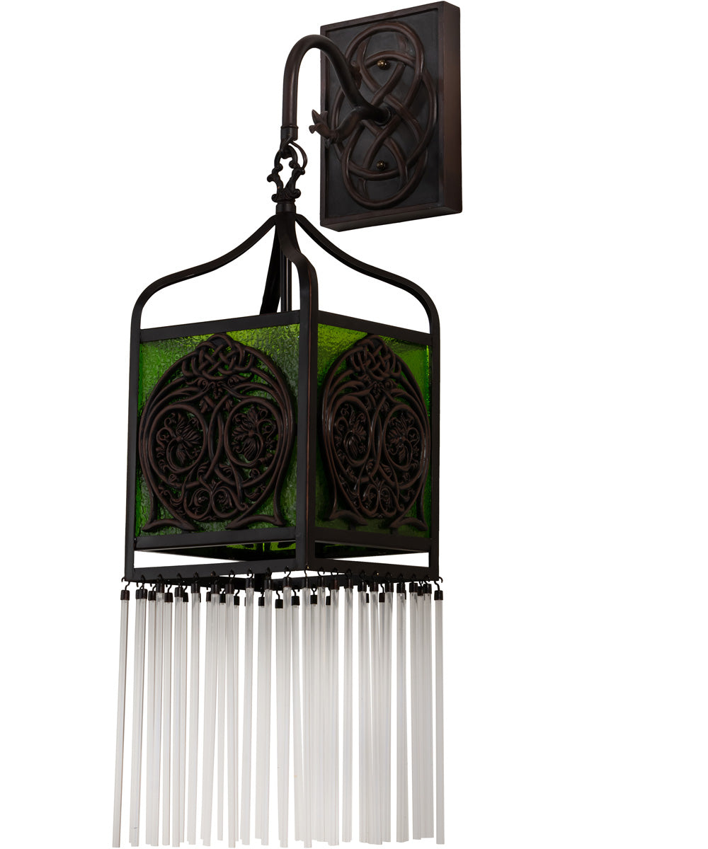 Inspired by Celtic Vines and Floral artwork; this Vine Lantern is a stunning piece of craftsmanship. The Celtic medallion hand finished in Mahogany Bronze overlays elegant Emerald Granite Glass. The Clear Fringe adds a nice touch to the hanging wall fixture. UL and cUL listed for dry and damp locations.