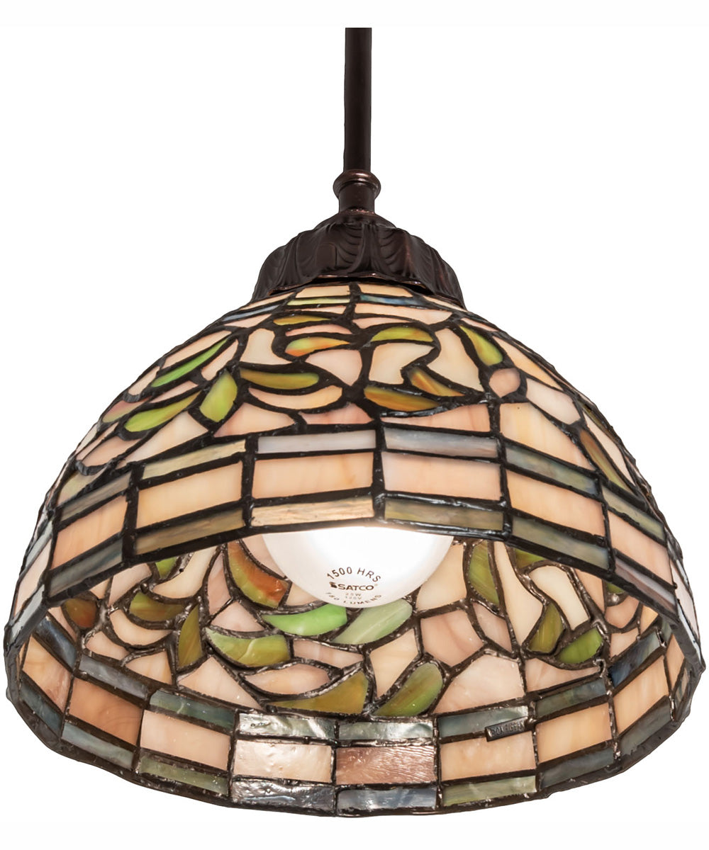 Subtle toned Autumn Gold; Russet and Moss Green leaves swirl against an Amber Mauve background in this Tiffany Studio stained glass reproduction. The mini pendant is enhanced with bands of Purple; Blue and Green and created using the famous Meyda Tiffany copperfoil construction process. This pendant is complemented with ornate cast hardware in a warm Mahogany Bronze finish. The Tiffany Turning Leaf Mini Pendant is featured in our American designed; handcrafted Tiffany Reproduction Stained Glass Lighting Collection. UL and cUL listed for dry and damp locations. Each shade is a unique work of art with color variations based on natural ingredients inherent in the glass. Contact us if color matching is critical when ordering multiple items.