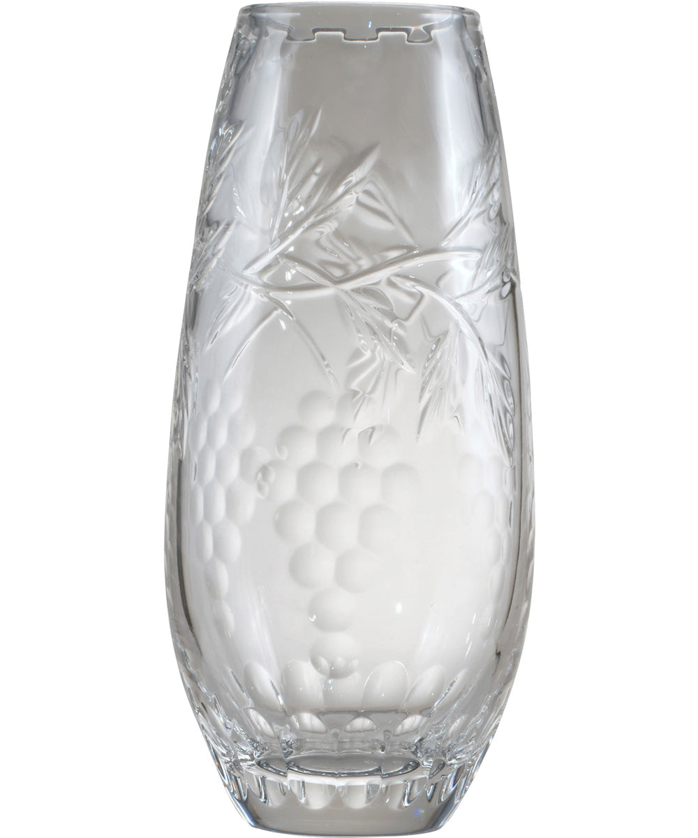 Our artisans have taken 24% lead crystal and hand cut a grape vine pattern, which creates a one of a kind sparkle when the facets catch the light in our Grape Vine series. This small vase makes a brilliant statement anywhere it is displayed. Beautiful on its own, or it can be paired with either the matching vase or decorative bowl. A lovely gift for someone special or for yourself, this is as uncommon a beauty that is as individual as you are. 24% lead solid crystal. 5" W x 9" H.