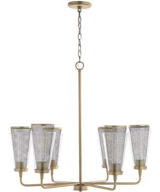 6 light chandelier with Aged Brass finish and Mesh and Clear shades.