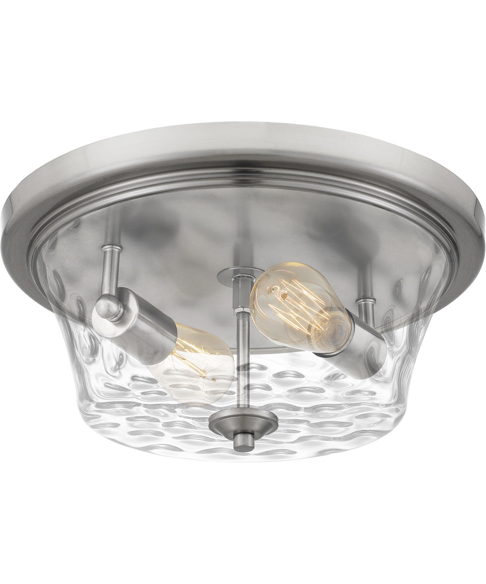The Acacia 2-light Flush Mount in Brushed Nickel is a striking addition to any home, blending modern elegance with timeless appeal. Its sleek, brushed nickel finish adds a touch of sophistication, while the dappled clear water glass shade creates a serene sense of movement and visual interest. The transitional style ensures it complements a variety of interior designs, from contemporary to traditional, making it a versatile choice for any room.