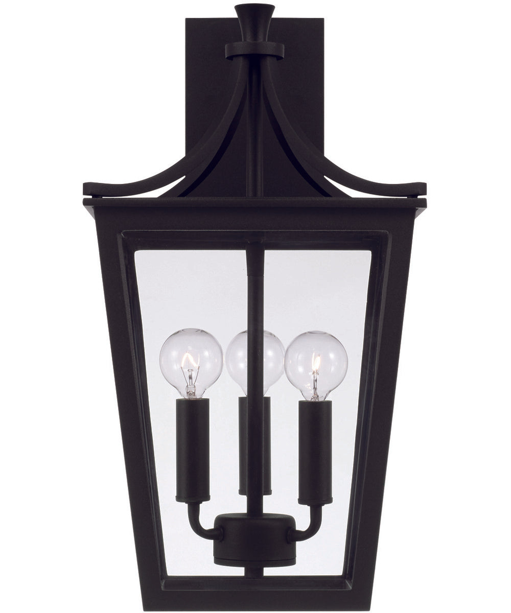 Enhance the exterior of your home with the Adair 3-Light Outdoor Wall Lantern. This striking fixture features a sophisticated black finish that adds a touch of elegance to any outdoor space. The lantern's design boasts gently curved tented lines at the top, creating a graceful silhouette that complements various architectural styles. Clear glass tapered panes encase the three candelabra-style bulbs, providing a classic yet contemporary look.