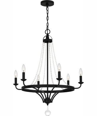 The Adelaide 6-light Chandelier in Matte Black is a stunning blend of modern sophistication and classic elegance. Its sleek matte black finish provides a bold contrast to the sparkling crystal accents, creating a visually striking piece that commands attention. The chandelier's traditional style is enhanced by its graceful curves and candelabra-style bulbs, evoking a sense of timeless charm with a hint of French country flair.