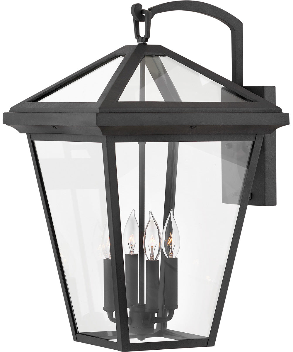 The Alford Place 4-Light Extra Large Outdoor Wall Mount Lantern in Museum Black by Hinkley exudes elegance and timeless style. Its classic lantern shape, characterized by clean lines and a pyramid-like top, adds a sophisticated touch to any outdoor setting. The Museum Black finish provides a sleek and modern appeal, while the clear glass panels allow for maximum light output, creating a welcoming ambiance.
