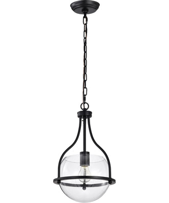 The Amado 1-Light Pendant boasts a sophisticated design with a clear glass shade that beautifully encases the light bulb. The pendant's shape is both classic and modern, with a rounded glass globe supported by a sturdy steel frame. The matte black finish adds a touch of understated elegance, making it a versatile piece that can enhance any room's decor.