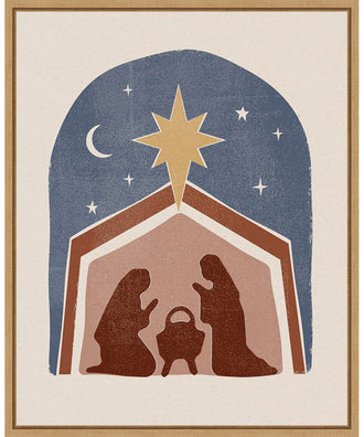 ART DESCRIPTION: This unique interpretation of the Nativity scene features a bohemian aesthetic with warm colors and intricate patterns. The image of Mary, Joseph, and baby Jesus is surrounded by the night sky and Christmas star. This Amanti Art canvas art print was created by Victoria Barnes and printed by Amanti Art in Madison WI. The canvas is stretched by hand and finished with a float frame. Individually made using traditional custom framing techniques, it has the quality you would expect from your local frame shop. Because of our attention to detail and focus on artistry, architects, interior designers, and homeowners alike choose this framed canvas artwork to create beautiful living spaces.
