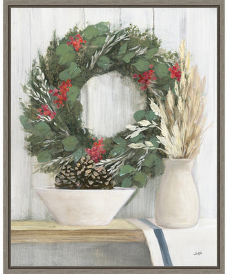 ART DESCRIPTION: A rustic farmhouse wreath adorned with berries sits behind a weathered wooden bowl full of pinecones, evoking a sense of warmth and comfort during the holiday season. The cool hues of the background provide a serene contrast to the vibrant reds and greens of the wreath, creating a harmonious balance between natural elements and festive cheer. This Amanti Art canvas art print was created by Julia Purinton and printed by Amanti Art in Madison WI. The canvas is stretched by hand and finished with a float frame. Individually made using traditional custom framing techniques, it has the quality you would expect from your local frame shop. Because of our attention to detail and focus on artistry, architects, interior designers, and homeowners alike choose this framed canvas artwork to create beautiful living spaces.