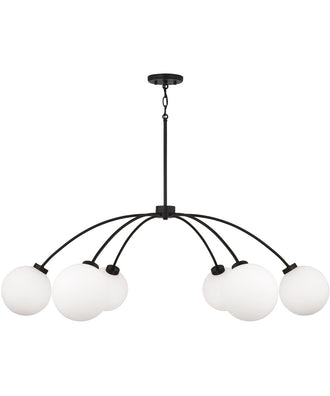 The Amos 6-Light Chandelier in Black Iron brings a modern touch to any space with its sleek, curved design and high-contrast elements. The chandelier features six Soft White glass globes that appear to float gracefully at the ends of the elegantly curved arms. The Black Iron finish, achieved through a unique sponge technique, adds a subtle texture that enhances the visual appeal of this stunning fixture.