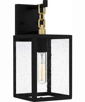 The Anchorage Medium 1-light Outdoor Wall Light is a true embodiment of elegance and modern design. Inspired by the refined aesthetics of jewelry, this wall lantern features simplified lines and a harmonious blend of metals. The sleek matte black frame provides a striking contrast to the clear seedy glass panels, creating a visually appealing fixture that enhances any outdoor space. The addition of a gold chain detail adds a hint of modern shine, making this light a stylish statement piece for your home.