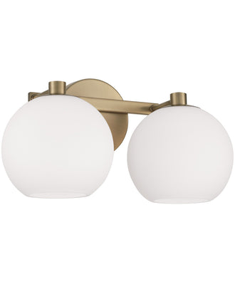Circular forms meet all-around versatility in the Ansley 2-Light Vanity for HomePlace. The Soft White glass globe shades illuminate sophisticated style, while the Aged Brass finish creates a mid-century aesthetic.