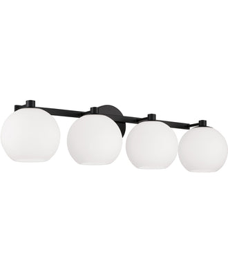 The Ansley 4-Light Vanity in Matte Black is an exquisite blend of modern design and timeless elegance. The circular forms of the soft white glass globe shades create a harmonious balance with the sleek, matte black finish. This contrast not only adds a touch of sophistication but also enhances the overall aesthetic appeal of your space. The matte black finish is powder-coated, providing a muted, neutral tone that seamlessly integrates with various decor styles.