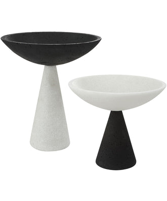 • Features: Set of two modern pedestal bowls are crafted from a striking black and white man-made stone that accurately replicating the look of thassos marble. sizes: s-10x9x10, l-10x12x10