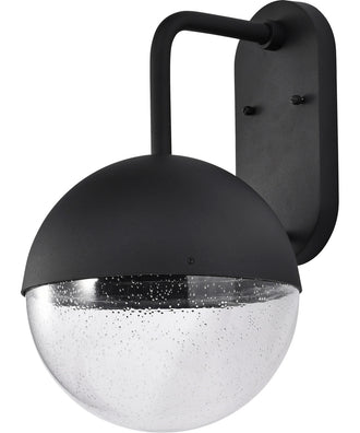 The Atmosphere 1-Light Outdoor Matte Black Wall Lantern by Nuvo Lighting is a stunning addition to any exterior space. Its sleek, modern design features a matte black finish that exudes sophistication and elegance. The lantern's shape is a perfect blend of contemporary and classic styles, with a rounded, dome-like top that transitions seamlessly into the clear seeded glass globe. This combination not only enhances the aesthetic appeal but also ensures a warm and inviting glow.