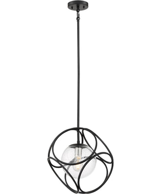The 14"W Aurora 1-Light Pendant in Black and Polished Nickel is a stunning addition to any space, combining modern aesthetics with timeless elegance. The pendant features a unique, artistic design with intertwining black metal loops that encase a clear seeded glass globe. This captivating design not only adds a touch of sophistication but also creates an eye-catching focal point in any room.