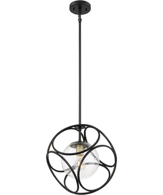 The 14"W Aurora 1-Light Pendant in Black and Vintage Brass is a stunning lighting fixture that combines modern elegance with a touch of vintage charm. Crafted by Nuvo Lighting, this pendant light features a unique design with a clear seeded globe glass encased in an intricate black steel frame. The vintage brass accents add a sophisticated contrast, making it a perfect statement piece for any room.