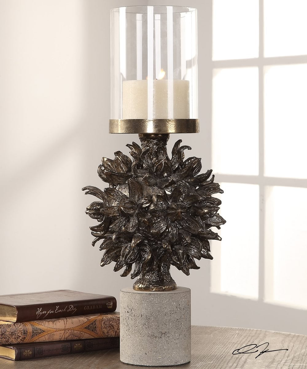 Clear Glass Globe Above A Cluster Of Life-cast Hawaiian Autograph Tree Pods Rendered In An Antique Bronze Finish, Set On A Concrete Cylinder Base With One, 4"x 3" Distressed Off-white Candle.Uttermost's Candleholders Combine Premium Quality Materials With Unique High-style Design.With The Advanced Product Engineering And Packaging Reinforcement, Uttermost Maintains Some Of The Lowest Damage Rates In The Industry. Each Product Is Designed, Manufactured And Packaged With Shipping In Mind.