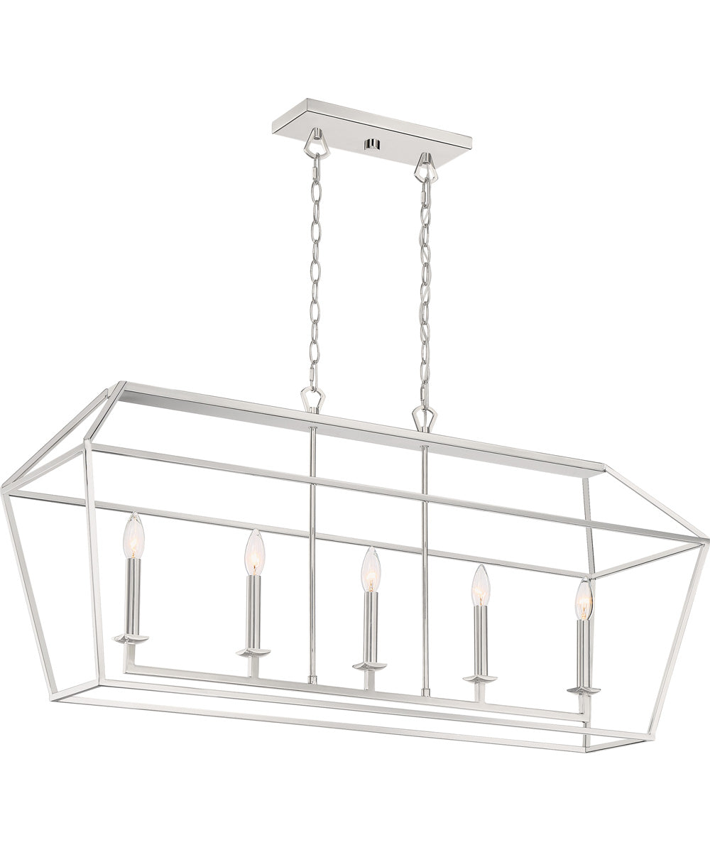 Transform your living space with the Aviary 5-light Island Light in Polished Nickel, a stunning centerpiece that combines industrial charm with modern elegance. This exquisite lighting fixture features a bold, angular design that instantly enlivens any room with its clean lines and sophisticated aesthetic.