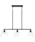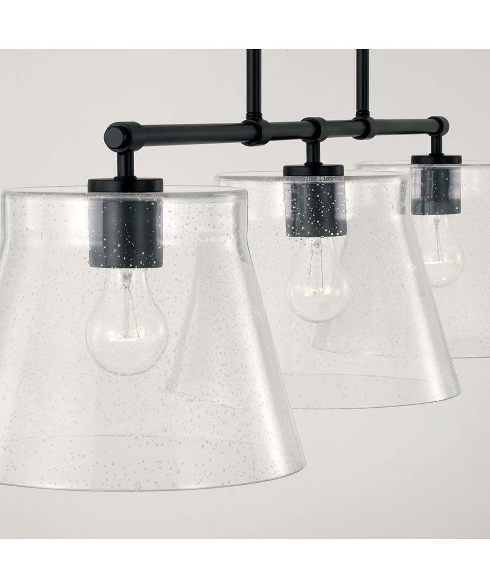 The Baker 3-Light Island in Matte Black effortlessly combines simplicity with sophistication, making it a standout piece in any home decor. Its sleek, minimalist design features a robust matte black finish that accentuates the fixture's clean lines and modern aesthetic. The three tapered seeded glass shades add a touch of elegance and texture, creating a visually appealing contrast against the matte black framework.