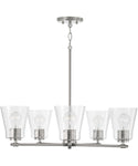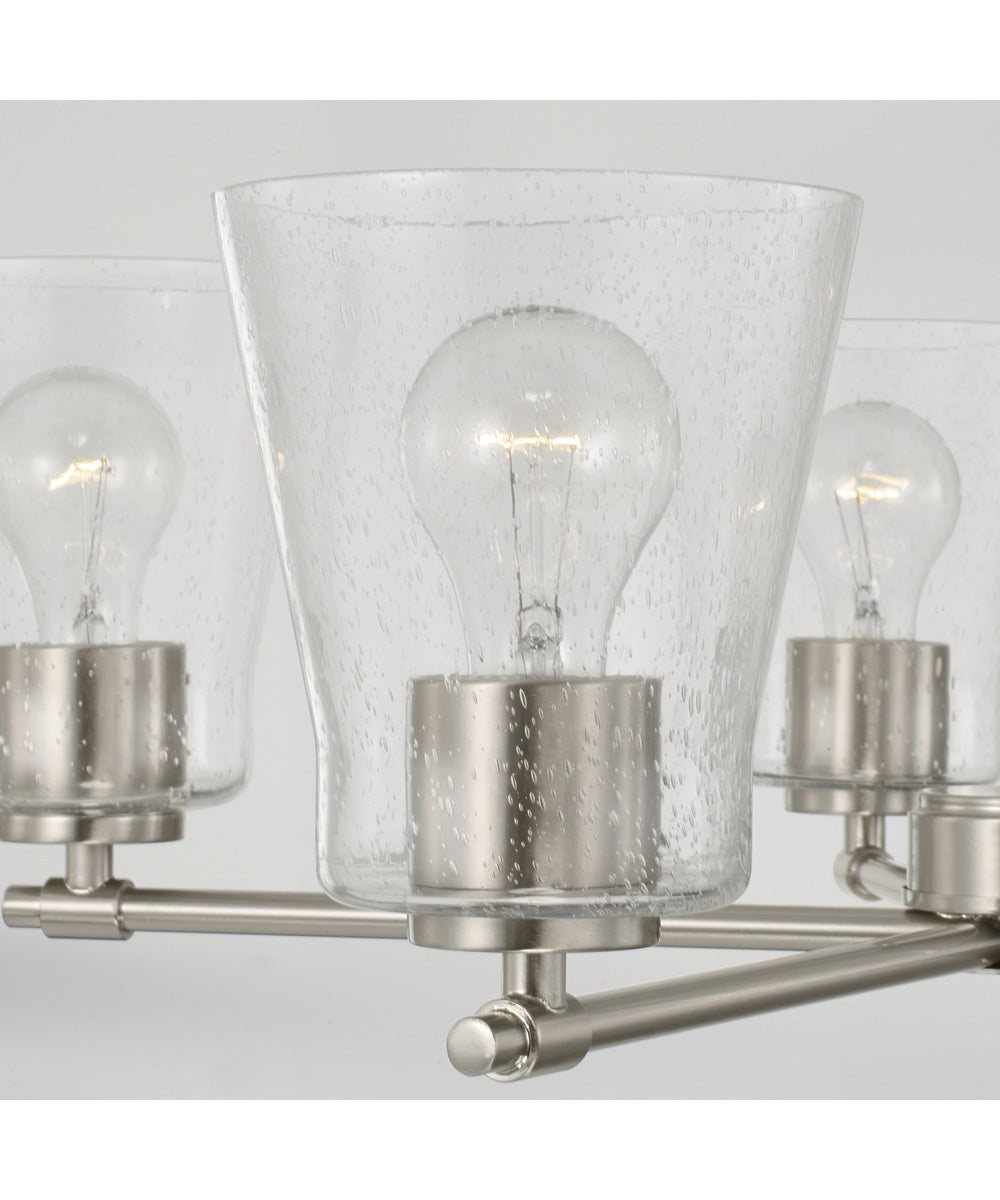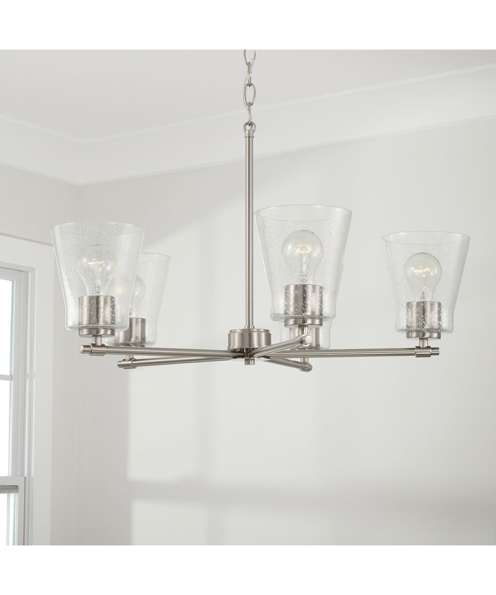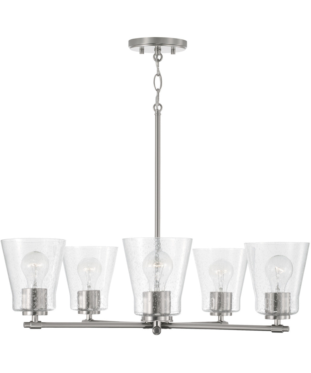 The Baker 5-Light Chandelier in Brushed Nickel is the epitome of modern elegance and functionality. This stunning chandelier features a sleek brushed nickel finish that complements its contemporary design. The chandelier's five lights are encased in tapered seeded glass shades, adding a touch of sophistication and a hint of vintage charm. Each glass shade is meticulously crafted to create an inviting ambiance, making it perfect for various room settings.