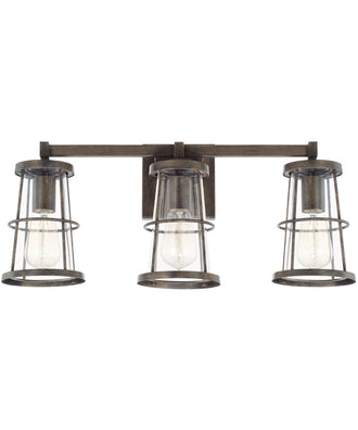 The Beaufort 3-light vanity in a rich Nordic Grey finish bathes your vanity mirror in farmhouse style. Clear tapered shades encased in cage-like frames cast a multidirectional glow, making morning and evening beauty routines easier and the ambience brighter.