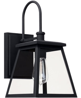 The Belmore 1-Light Outdoor Wall Mount exudes timeless elegance with its sleek black finish and clear glass panels. The lantern's design is reminiscent of classic outdoor lighting, featuring a sturdy rectangular frame that gently tapers towards the bottom, creating a sophisticated silhouette. The curved arm and square backplate add to its traditional charm, making it a versatile addition to any exterior decor.