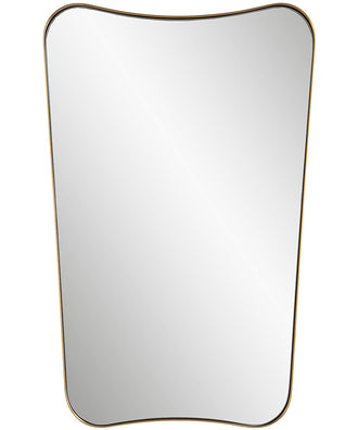This vanity mirror features a sophisticated stainless steel frame finished in a rich antique brass, surrounding a floating polished-edge mirror. the curved silhouette adds a contemporary feel to this piece.