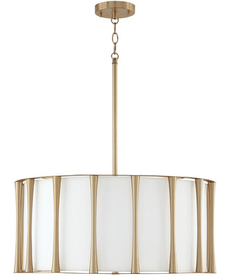 The Bodie 4-Light Pendant in Matte Brass is a stunning addition to any space, exuding both elegance and sophistication. The pendant features a unique design with tapered columns that frame a tailored fabric shade, creating a visually appealing luminaire that enhances the aesthetic of your room. The matte brass finish adds a touch of luxury, making it a statement piece that complements various interior styles.
