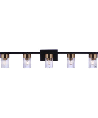 Experience the quiet luxury of the Bond Street Collection by Craftmade featuring slender clear fluted glass captured in satin brass supported by a rich flat black frame. The Bond Street vanity collection is available in five sizes from a single sconce to five light vanity.