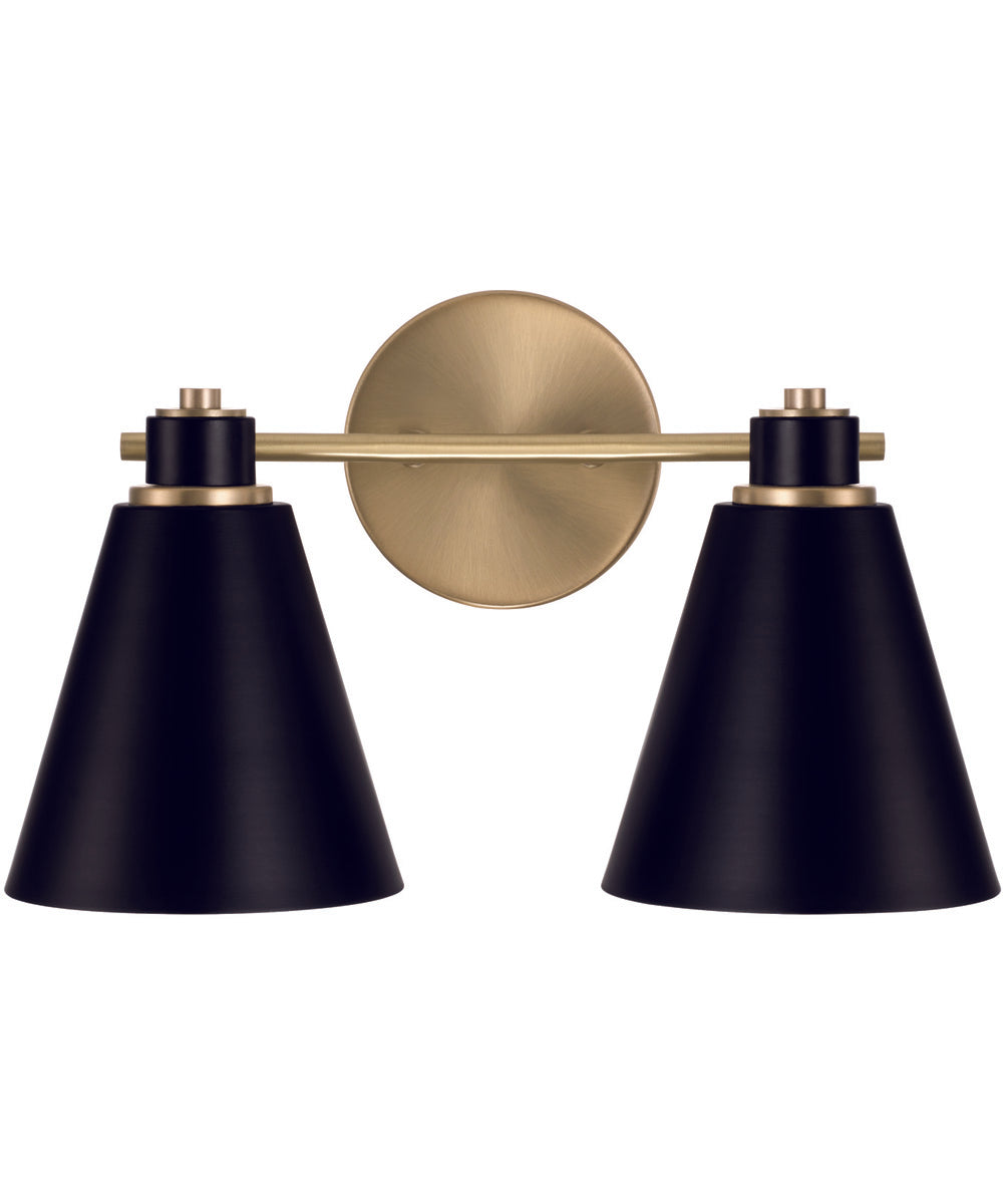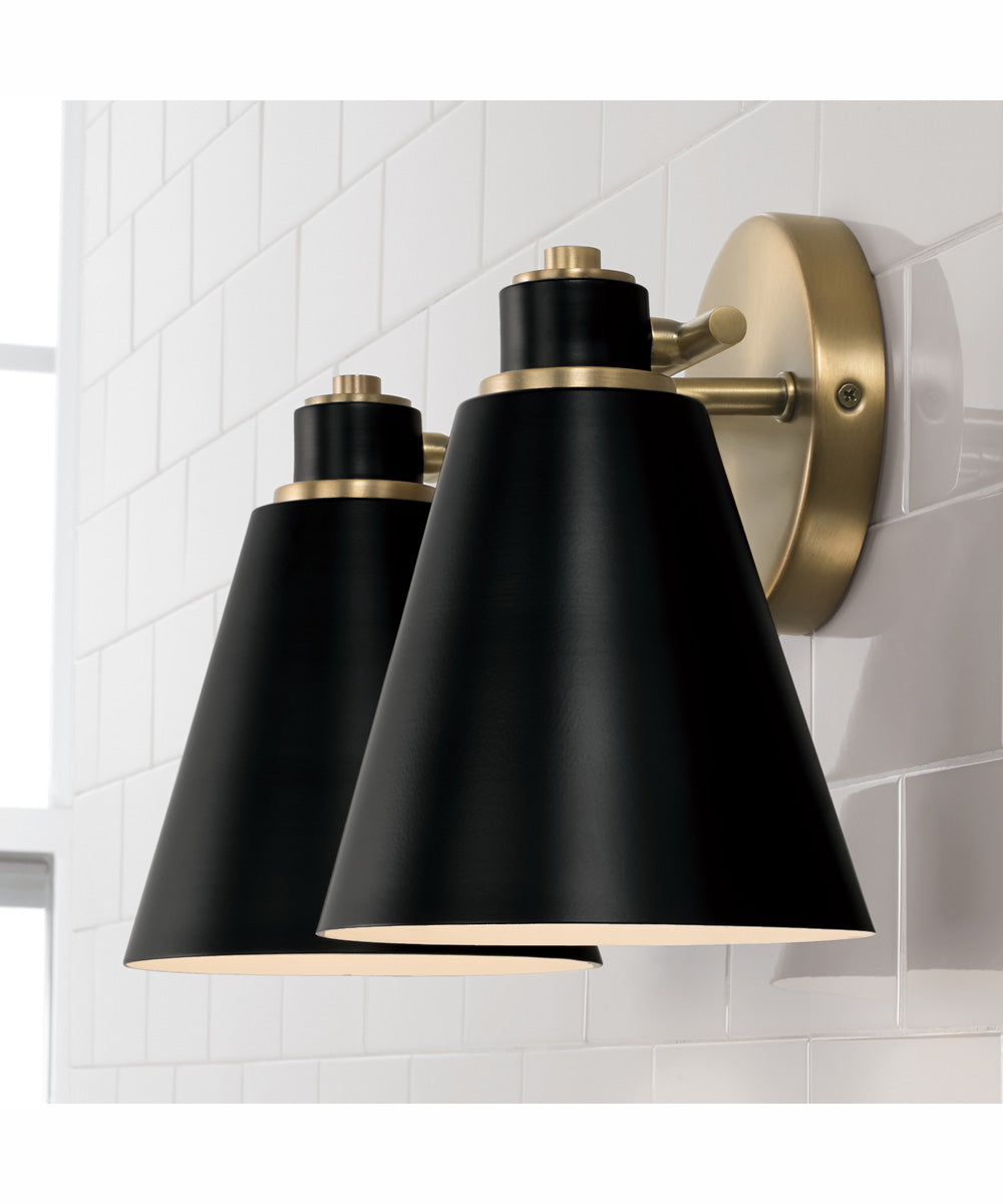 Bring a bold, modern look to traditional bath lighting with the Bradley 2-Light Vanity. The Aged Brass accents and crisp metal shades bring distinct style, while the Matte Black exterior and White interior shade finishes create down-light illumination that is perfect for powder rooms or focused task lighting.
