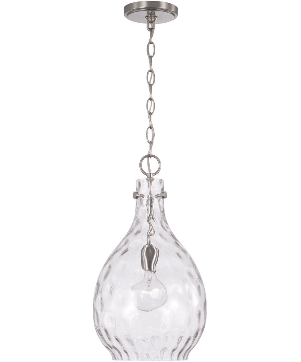 The Brentwood 1-Light Pendant in Brushed Nickel is the epitome of chic curves and simple style. Its teardrop shape, accentuated by a clear water glass finish, brings an elegant and sophisticated touch to any space. The brushed nickel finish offers a soft, visual texture with light-medium grey tones and slightly warm undertones, making it versatile for various interior styles.