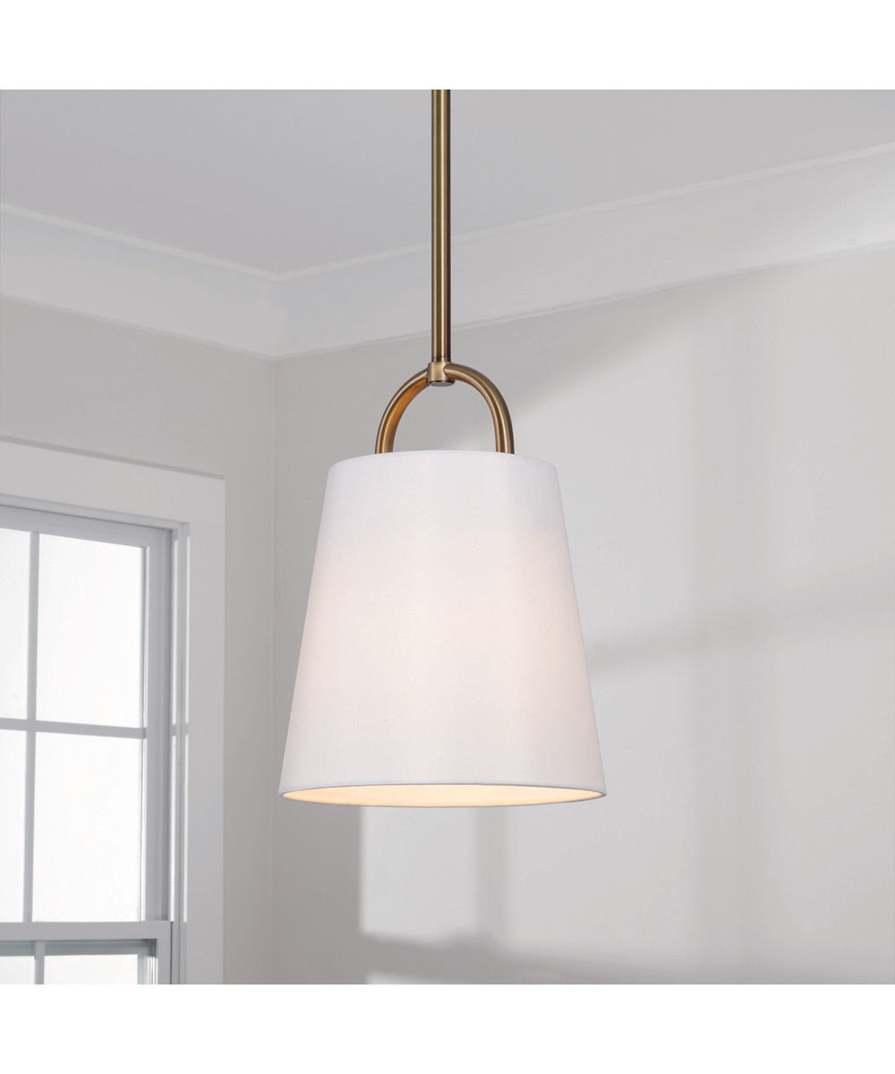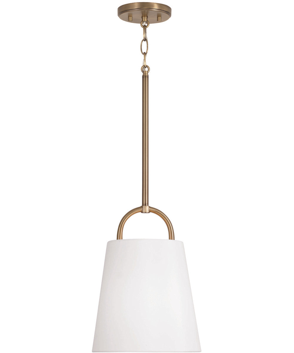 Embodying true minimalist form, the Brody Small Pendant brings sleek, simplified style. The Aged Brass finish enhances the classic look of the white fabric shade to deliver sophisticated, less-is-more design. The open arched top meets again just below the shade to form a single socket, creating this unique look while balancing the pendant's light source.