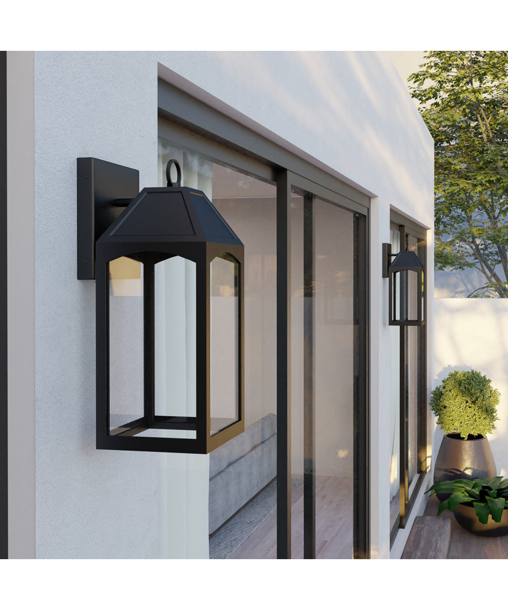 Outdoor wall lanterns, also referred to as porch lights or garage lights, are mounted onto a wall. Usually they are ideal next to an entrance or either side of a garage. They will light up the local area and most of the yard, although a larger space may need more than one. Being fixed to the wall they place the light closer to the building, ideal for entering or exiting, or to help with parking. They are installed electrically as a hardwired fixture and usually operated by a wall switch or sensor.
