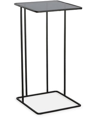 • Features: Minimally designed with versatility, this petite hand forged iron accent table is finished in brushed black with a smoked glass top.