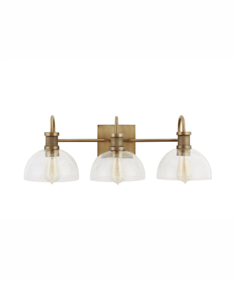 Mid-century modern vibes are created by the smooth clear glass domes and arched Aged Brass metal frame. The texture of the sockets gives this 3-Light Vanity a bit of character and industrial charm.