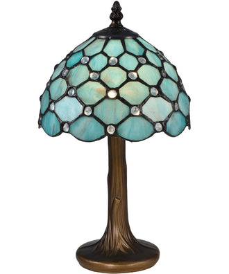 The tranquil tone of our Castle Point Table Lamp is a harmonious addition to any decor style. The dome shade is handcrafted of diamond shaped art glass pieces in soothing light turquoise. Each piece is bordered with bold filigree. Clear art glass gems are set at the intersections of the filigree to create a quilted pattern that will glow gently with bright pops of sparkle when the lamp is illuminated. We paired Castle Point with a tree trunk base that is finished in Antique Bronze and topped it with a matching cut out vase cap and flame finial, which gives the lamp its overall treelike appearance. A very pretty choice wherever you choose to display it, our Castle Point Table Lamp will provide your family with many years of artistically reliable lighting.