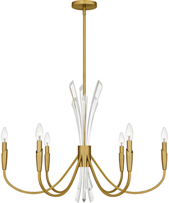 This chandelier features six candelabra-style lights, each capable of holding a 60-watt bulb (not included), providing ample illumination for any space. The crystal center column introduces a touch of sparkle and luxury, reflecting light beautifully and adding a layer of sophistication. The fixture is constructed from high-quality steel, ensuring durability and longevity.