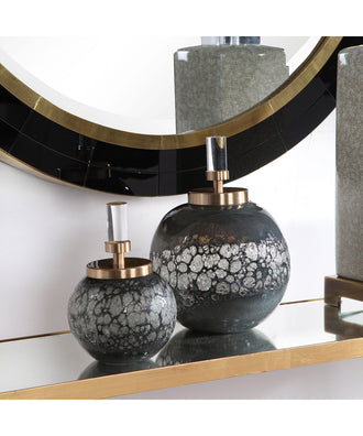Set Of Two Art Glass Bottles Feature Organic Texture With An Iridescent Blue-gray Hue. Each Bottle Is Paired With A Brushed Brass Plated Lid And Crystal Accent. Sizes: S-5x8x5, L-7x10x7Uttermost's Accessories Combine Premium Quality Materials With Unique High-style Design.With The Advanced Product Engineering And Packaging Reinforcement, Uttermost Maintains Some Of The Lowest Damage Rates In The Industry. Each Product Is Designed, Manufactured And Packaged With Shipping In Mind.