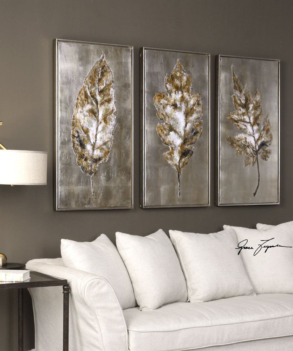 Contemporary In Design, These Hand Painted Canvases Feature Rich, Metallic Hues. Gold, Bronze, And Cream Colored Leaves Are Set Against A Bright Silver Background. The Canvas Is Stretched And Attached To Wooden Stretching Bars. A Slim, Champagne Silver Gallery Frame With Burnished Accents Completes Each Piece. Due To The Handcrafted Nature Of This Artwork, Each Piece May Have Subtle Differences.Uttermost's Art Combines Premium Quality Materials With Unique High-style Design.With The Advanced Product Engineering And Packaging Reinforcement, Uttermost Maintains Some Of The Lowest Damage Rates In The Industry. Each Product Is Designed, Manufactured And Packaged With Shipping In Mind.