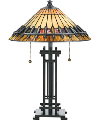 The Chastain Small 2-light Table Lamp pays homage to the enduring Arts and Crafts style, characterized by its straight lines forming squares and rectangles. This exquisite lamp features a handcrafted shade made of multicolor Tiffany glass, showcasing a stunning array of hues that bring a touch of elegance and sophistication to any room. The coordinating base, crafted from durable resin, boasts an authentic bronze patina, enhancing its timeless appeal.
