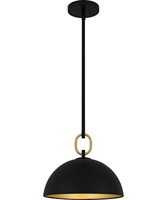 The Cleo pendant light boasts a minimalist yet impactful design. Its metal shade, finished in matte black, creates a bold statement while maintaining a clean and contemporary look. The interior of the shade is adorned with a striking gold finish, which not only adds a touch of luxury but also enhances the lighting effect by casting a warm and inviting glow. The pendant is suspended from a slim black cord, adding to its sleek and streamlined appearance. A distinctive feature is the gold ring detail that connects the shade to the cord, adding an extra layer of visual interest and sophistication.