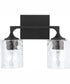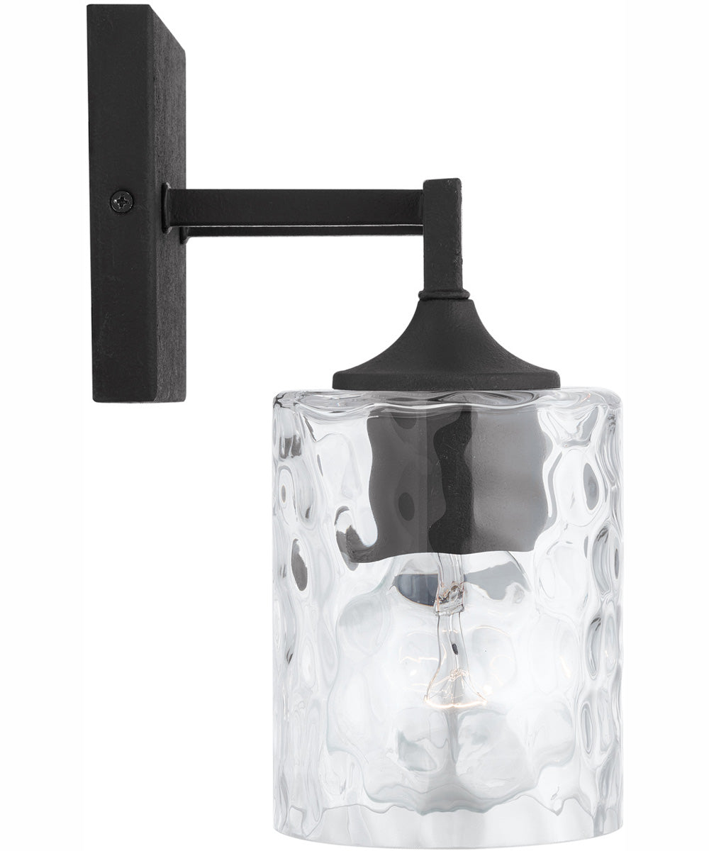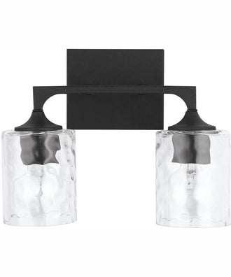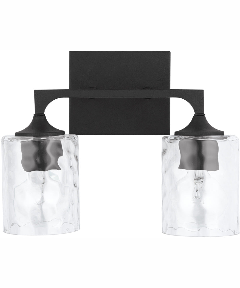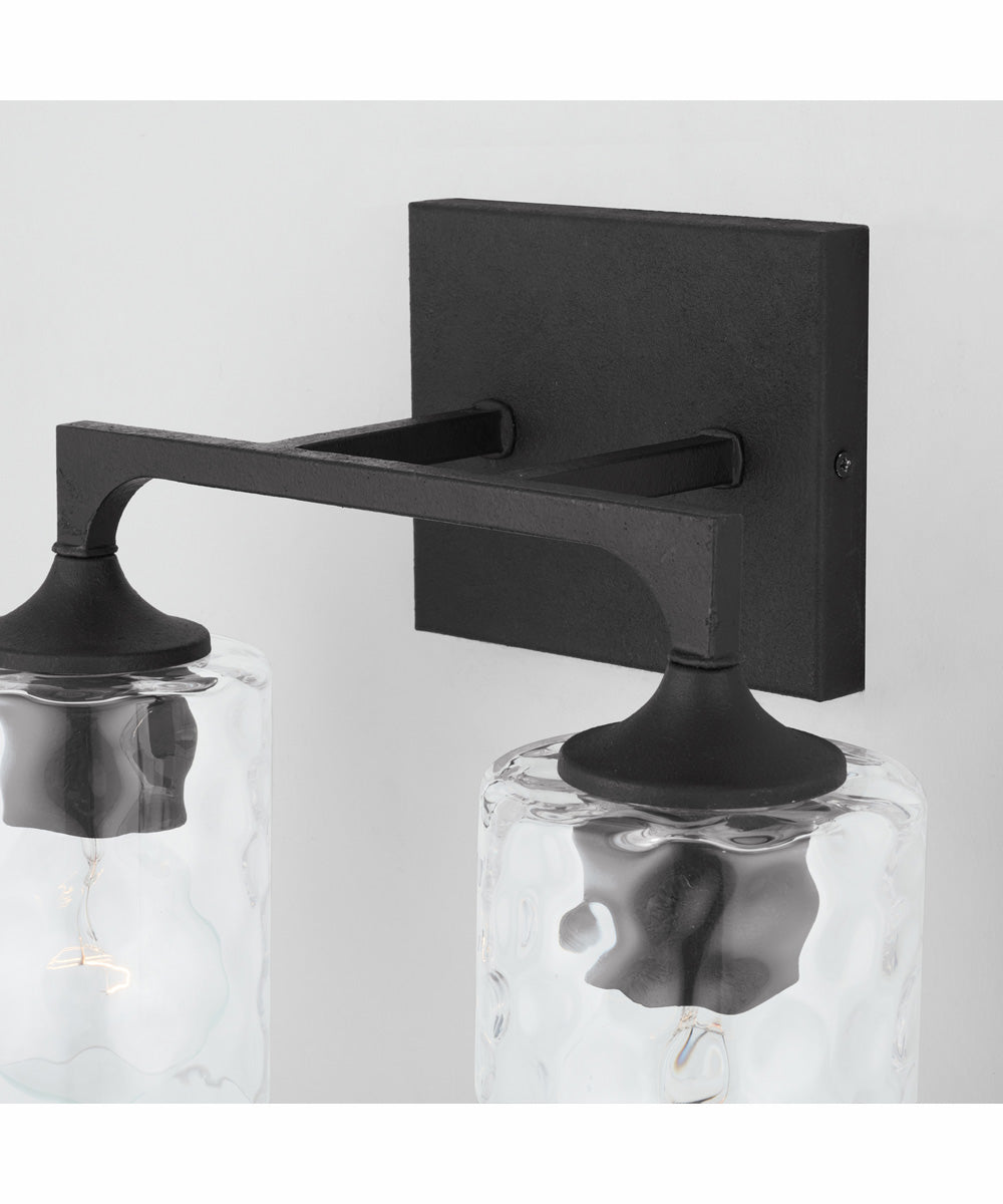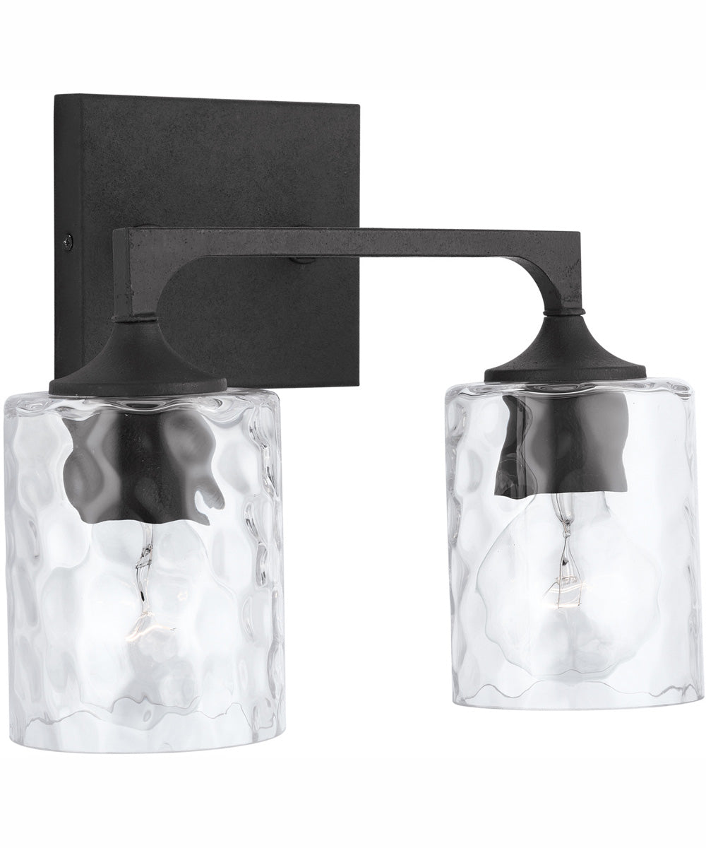 Understated, simple lines beautifully complement the bold prominence of the Black Iron finish on the Clint 2-Light Vanity. The unique corner details of this transitional design are reminiscent of turn of the century style. Featuring dimpled water glass, this vanity is available as a 2-light or 3-light.