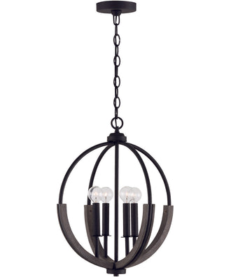 The Clive 4-Light Pendant in Carbon Grey and Black Iron is a stunning addition to any home, offering a fresh take on farmhouse style. Its classic orb silhouette is beautifully complemented by the textured accents of wire-brushed mango wood and wrought iron-like black metal. The Carbon Grey finish on the wood pairs handsomely with the Black Iron, creating a look that adds dimension and sophistication to any space.