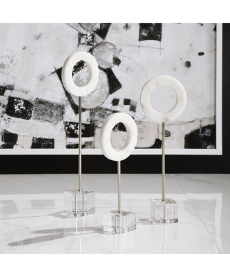 Contemporary Trio Features Solid White Marble Rings Supported By Polished Chrome Rods And An Elegant Crystal Base. Sizes: S-6x15x3, M-6x19x3, L-6x22x3Uttermost's Figurines & Sculptures Combine Premium Quality Materials With Unique High-style Design.With The Advanced Product Engineering And Packaging Reinforcement, Uttermost Maintains Some Of The Lowest Damage Rates In The Industry. Each Product Is Designed, Manufactured And Packaged With Shipping In Mind.